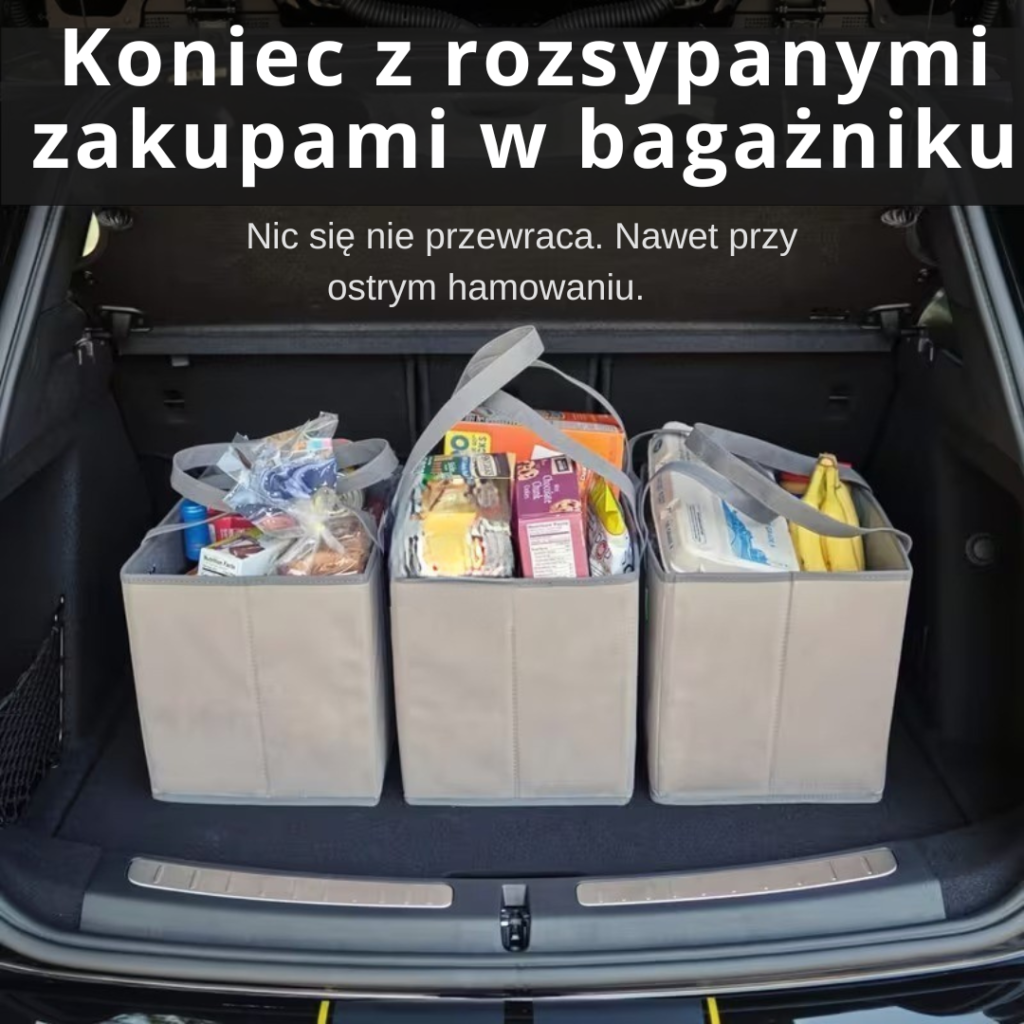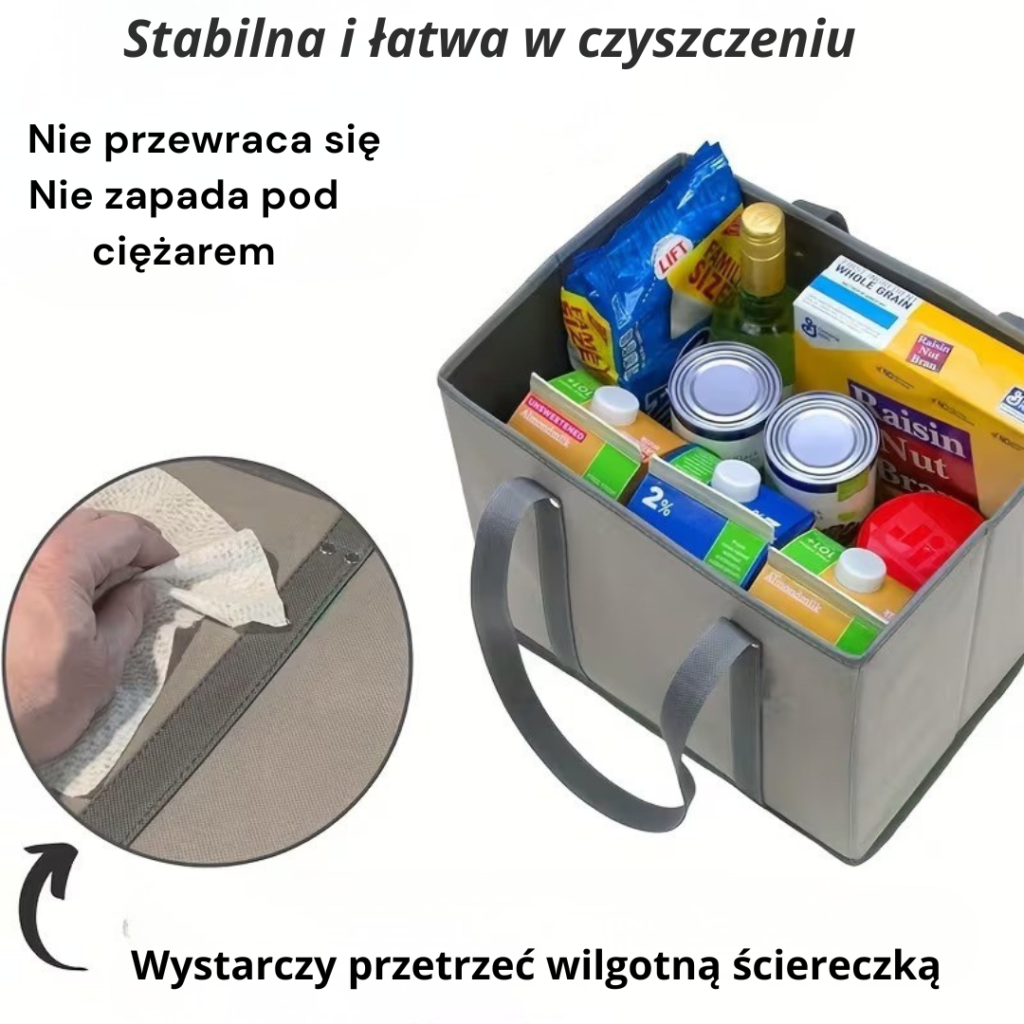 Twoje zakupy pozostają stabilne i bezpieczne – bez przewracających się butelek, rozgniecionych produktów i bałaganu w bagażniku.